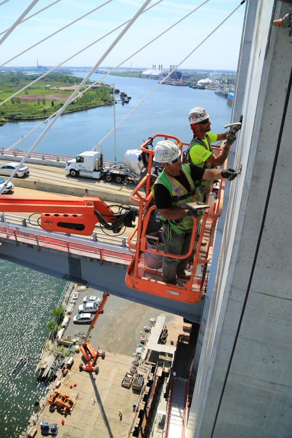 Workers putting the finishing touches on a column of the new Goethals Bridge