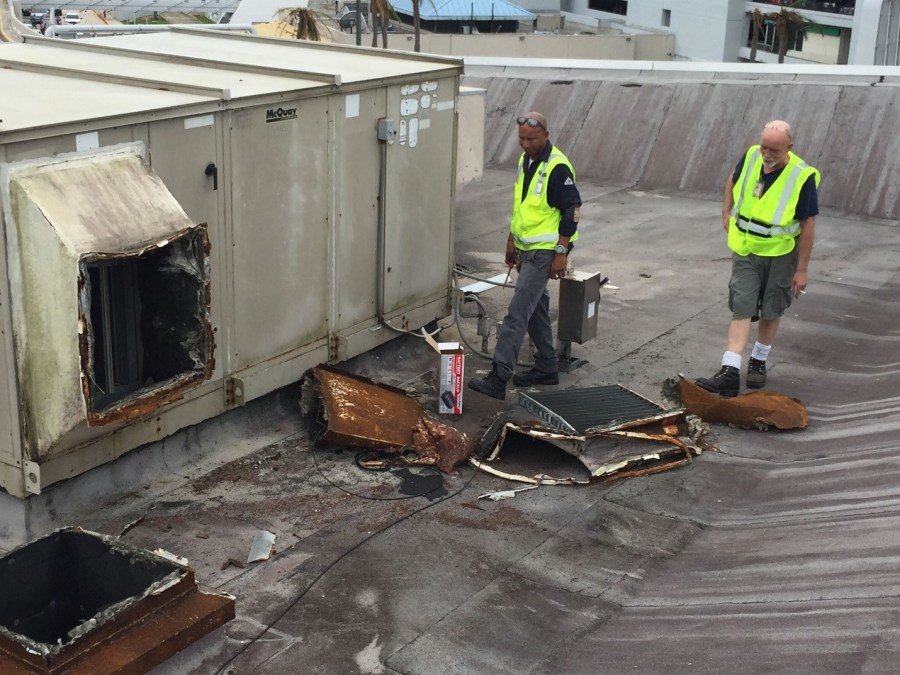 Surveying some of the rooftop damage at the airport