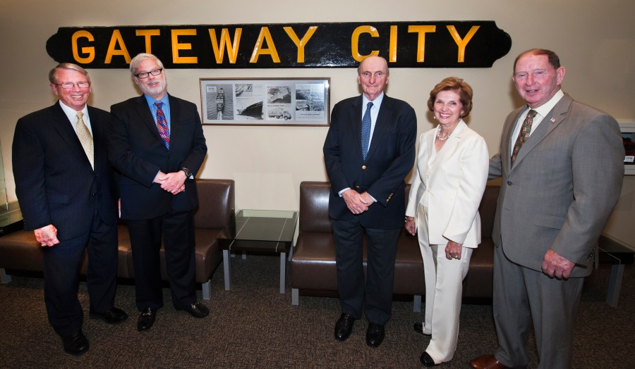 Left to right: Rick Larrabee, departing Director of Port Commerce; Patrick Foye, Executive Director of the Port Authority; Charles Cushing, who served as 3rd mate on the Gateway City while a student at MIT; Lillian Borrone, former Director of Port Commerce; and Jim Devine, former CEO of Global and New York Container Terminal, who donated the name plate to the Port Authority