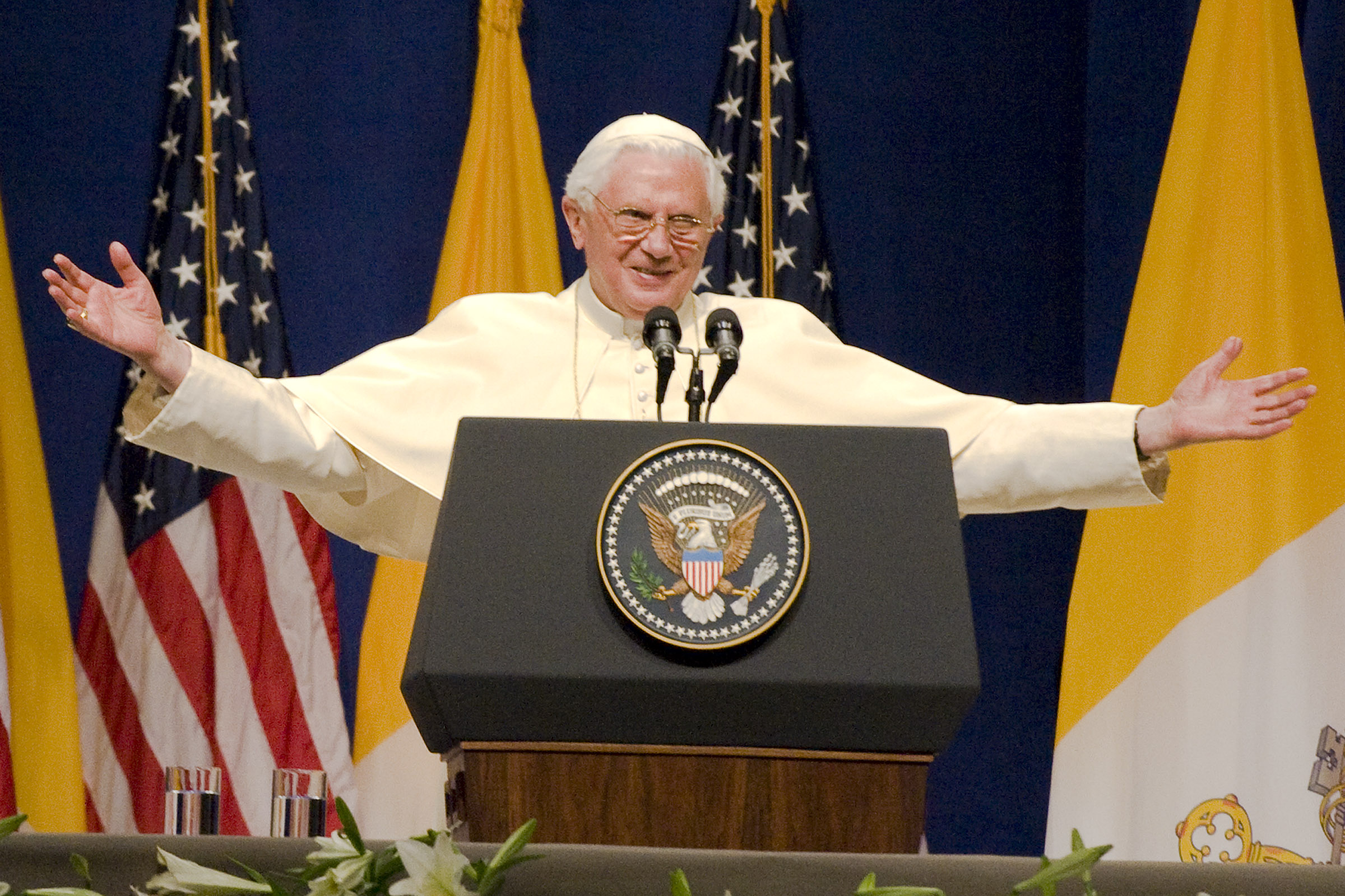 With outstretched arms, the Pope bestows a final blessing.