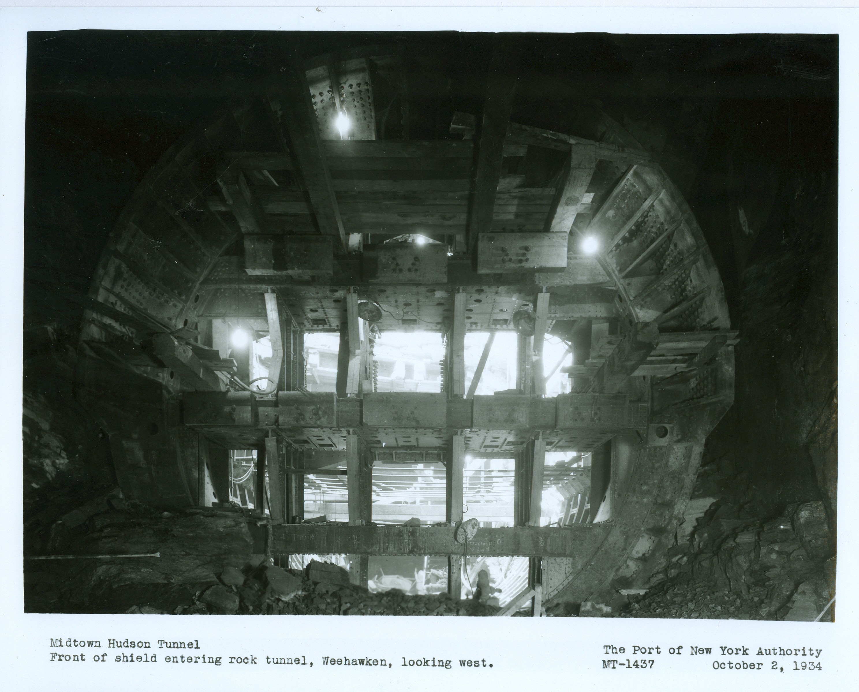 A closeup of the cutting shield. The steel edge projects forward at the tops and the sides like the visor of a cap and protects workers underneath from falling debris. 7. A battery of hydraulic jacks with a thrust of 6,000 tons pushed the cutting shield through the earth and into the silt and rock of the riverbed.