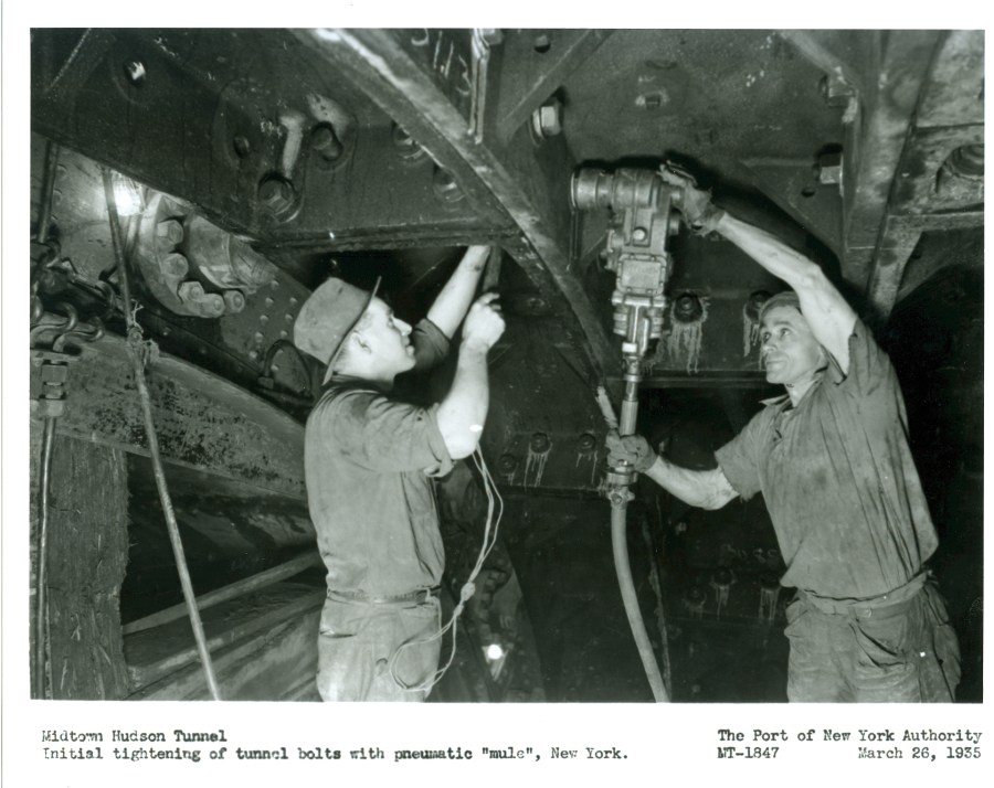 Workers tightening the tunnel bolts. Most of the skilled sandhogs on the job received an average of $10 for a day’s work, which consisted of two three-hour shifts with three hours’ rest in between.