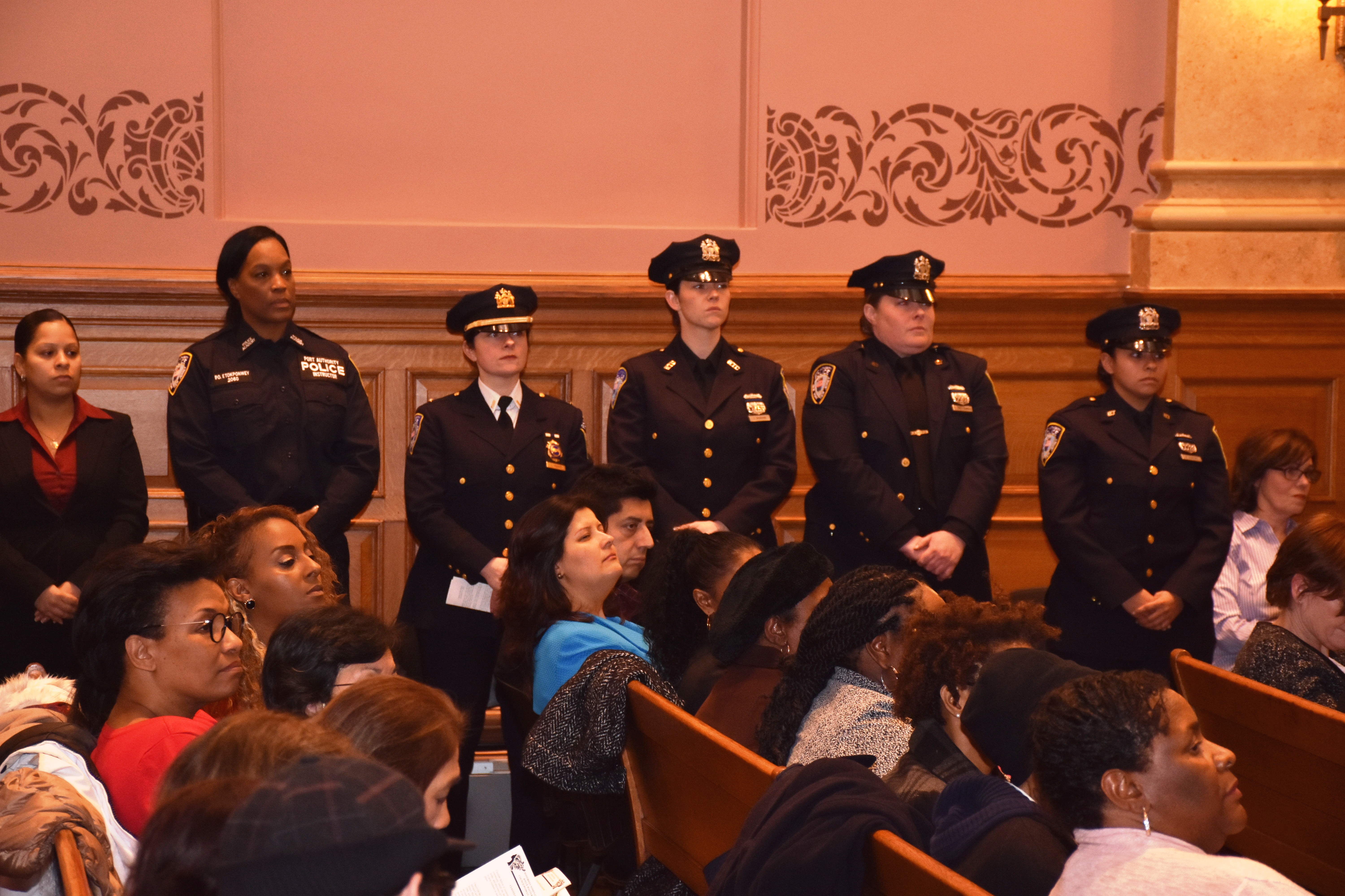 Female PAPD officers stand at attention in a show of respect for the fallen officer