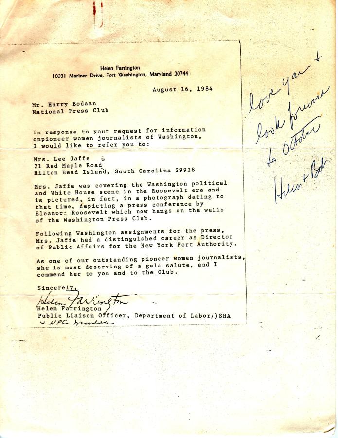 A letter to the National Press Club describes Jaffe as a “pioneer woman journalist of Washington”
