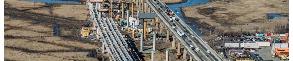 They dwarf the construction workers who guide them atop column caps ranging from 20 to 120 feet above the ground, as well as the heavy-duty cranes needed to lift them and even the columns themselves. For more on the project, see today’s photo essay by the Port Authority’s Rudy King and Michael Dombrowski, and Dombrowski’s time-lapse video of their installation.