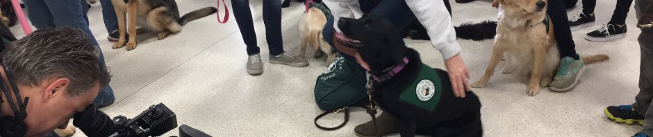 A few of them wobbled like models in tall heels as they practiced walking the slippery stairs between terminal levels. They learned the patience required to get through a TSA security checkpoint, the self-control of waiting at the gate to board the airplane. They learned to feign disinterest as a toy poodle crossed their path in a cage. They were paraded through a smorgasbord of sights, sounds and smells in the Terminal C food court. And if any puppy was drooling for a slice of pizza, they had the good sense not to show it. They were on their way to becoming professionals.