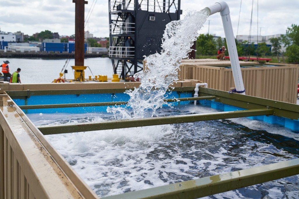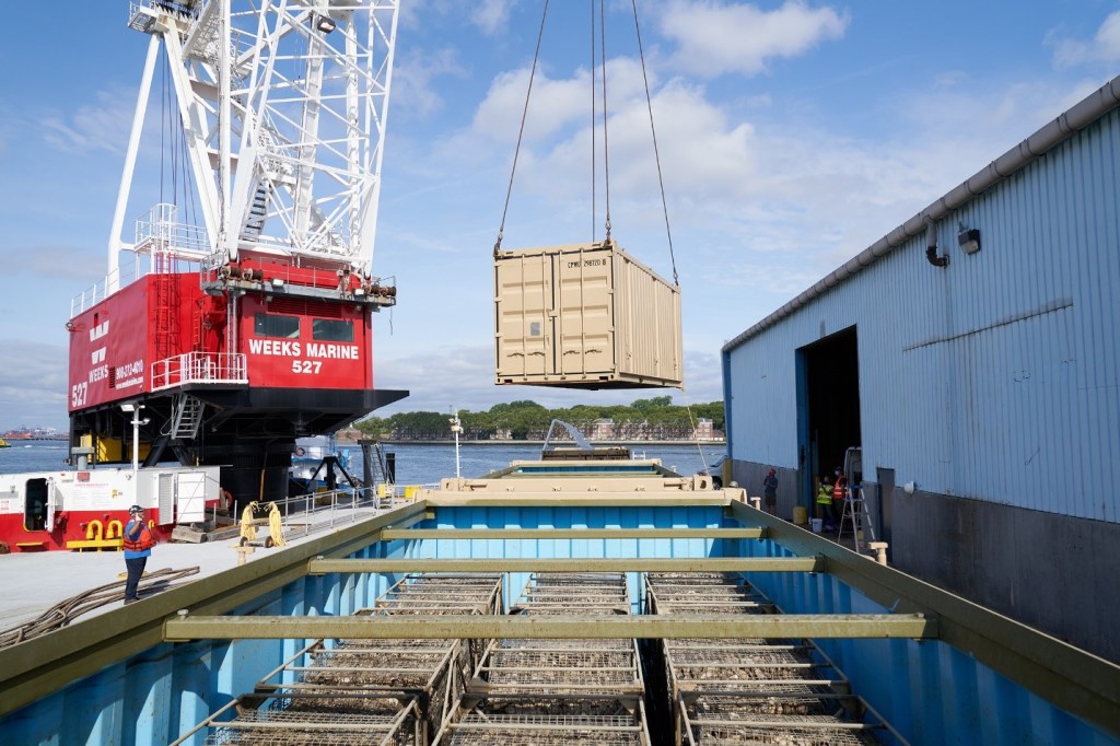 The collaboration with BOP provides waterfront access and the logistics equipment needed to hoist the shipping containers – each filled with 9,000 gallons of seawater and oyster racks – onto Port Authority-owned barges to carry baby oysters to the farther reaches of New York Harbor. Oysters are just as delicate as their taste; the babies cannot survive long outside their optimal living conditions. Ensuring they remain blissfully uninterrupted in their watery homes is crucial to their survival.