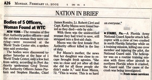 A news clipping dated February 11, 2002 confirms that Captain Mazza’s remains had been found, along with other PAPD officers