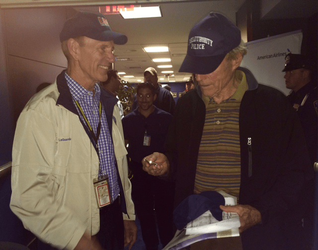 LaGuarda Airport’s Jim Munday presents a Challenge Coin to Clint Eastwood during filming of Sully.