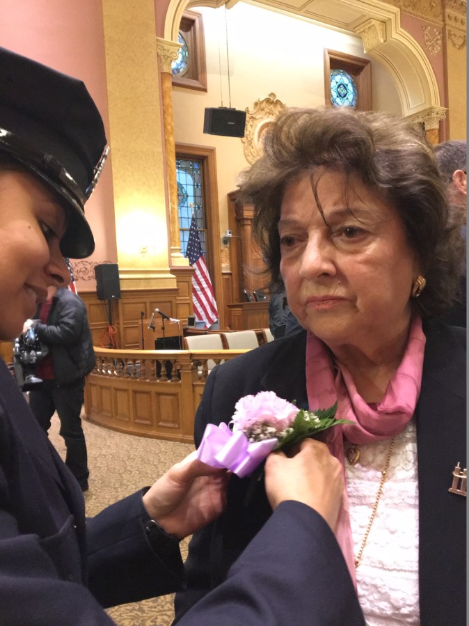 Sgt. Hernandez pins a corsage on Captain Massa’s mother, Rose Mazza, at the start of 2016 Women of Action Awards in Jersey City